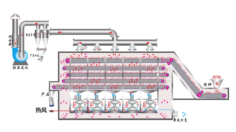 帶式幹燥機主要由進風單元、排風單元、循(xún)環風單元、網帶、加熱係統、加料器、傳動機構、控製係統等部件組成。物(wù)料由撒布機均勻地鋪在網帶上,網帶采用12-60目不鏽(xiù)鋼(或碳鋼)絲網(wǎng),由傳動裝置拖動在幹燥(zào)機內移動,幹燥段由若幹單元組成(chéng),熱空氣通過風機穿(chuān)過物料層,完成熱量與物料的交(jiāo)換過程,含水量較大的氣體由排風機排出(chū)。